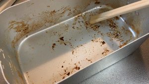 - お湯を捨て、わりばしで擦って浮いた焦げを落としスポンジで洗います。